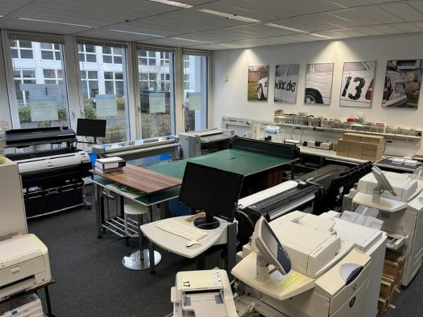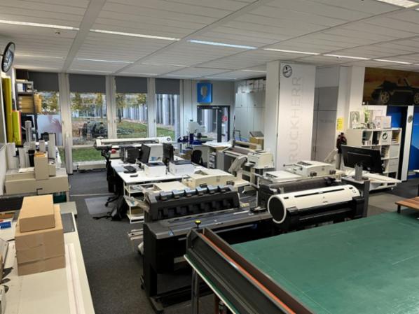 Umfangreicher Maschinenpark für Digitaldruck, Großformat, Weiterverarbeitung, Textildruck und Sublimation. Lagerbestand ca. 25.000 €. Drei Kundenarbeitsplätze inkl. neuem A3-Foto-/Posterterminal.