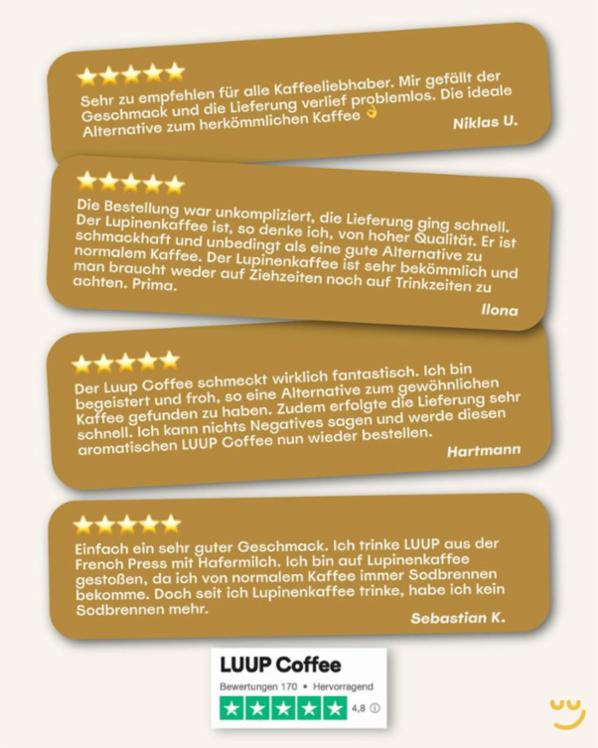 LUUP trifft damit den Nerv der Zeit. Unsere Zielgruppe besteht aus gesundheitsbewussten Genießern, die Kaffee lieben, aber sich nicht länger mit Sodbrennen, Herzrasen oder schlechtem Schlaf abfinden wollen. LUUP ermöglicht es ihnen, ihr Kaffeeritual zu behalten – ohne Nebenwirkungen. Und mit einem richtig guten Gefühl.
