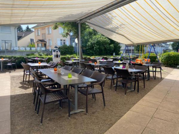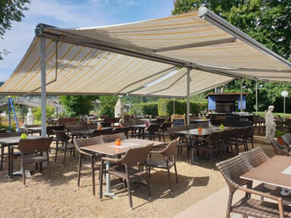 Biergarten/Terrasse: ca. 150 Sitzplätze, externer offener Holzkohlengrill in einer offenen Hütte, sonnig und einladend