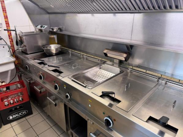 - voll funktionsfähige Imbisszeile mit u.a. 4 Fritteusenbecken, Pommeswärmer, Bain-Marie und vollausgestattete Gastroküche inkl. u.a. Konvektomat, Flexi-Chef, Pizzasaladette, Kühlvitrine und Warmhalteschrank