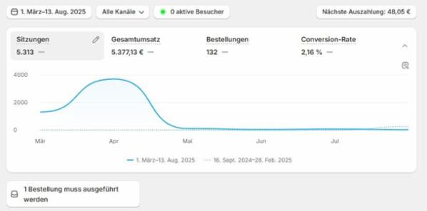 Bis Mai hatte er rund 5370,-€ Bruttoumsatz erwirtschaftet (davon rund 3800,-€ allein im April). Leider musste ich aus Zeitgründen den Shop zurückstellen und habe Anfang Mai die Werbung auf Facebook abgeschaltet, aber den Shop immer Online gelassen und die Bestellungen der Bestandskunden trotzdem bearbeitet.