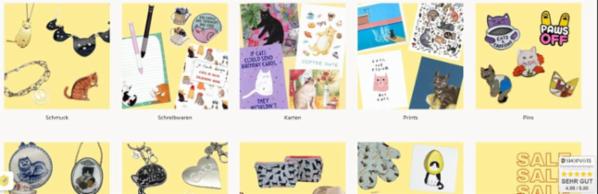 Der Online-Store kuratiert stilvolle und handverlesene Geschenke für Katzenliebhaber*innen mit Illustrationen und Designs von kreativen Köpfen aus aller Welt. Es gibt Schmuck, Schreibwaren, Post- und Grußkarten, Kunstdrucke, Pins, Schlüsselanhänger, Geldbeutel, Taschen, Wohnaccessoires, DIY & Spiele, Haushaltgegenstände. Außerdem gibt es in einer sehr großen Sonderkategorie einen Flohmarkt mit Raritäten, die wir nur einmal auf Lager haben. Diese Fundstücke erfreuen sich großer Beliebtheit und haben auch die größten Gewinnmargen. Der Shop ist also ein zentraler Marktplatz, der Katzenkünstler*innen und Katzen-Fans zusammenbringt.