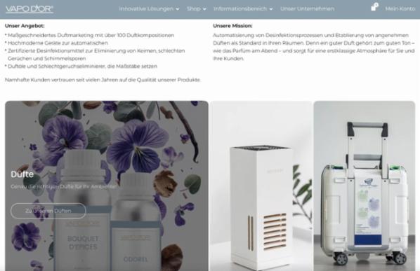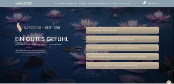 Zum Verkauf steht die Firma VAPO D’OR (VAPODOR.com), ein seit über 25 Jahren erfolgreich etabliertes Unternehmen in den Bereichen Raumbeduftung, Desinfektion, Geruchsneutralisierung und Schimmelbekämpfung.