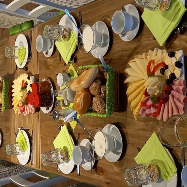 Kulinarik: Frühstück mit Blick in den Stall zu Eseln und Alpakas ( Einzigartig in der Region), hausgemachte Kuchen/ Torten, saisonale Themen, kleine Gerichte.