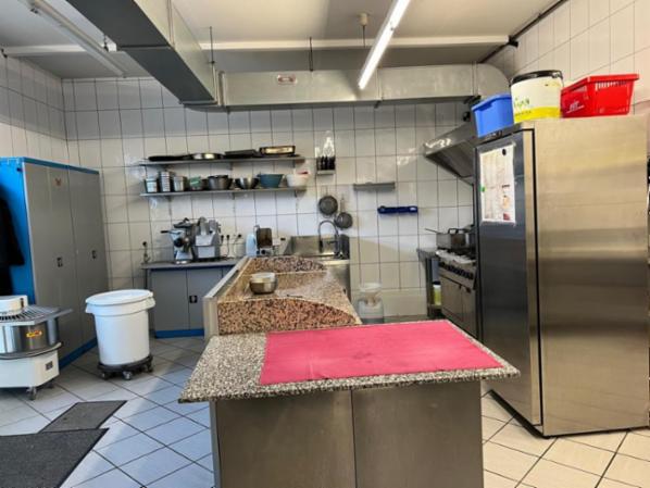 Der Verkaufsraum beinhaltet eine moderne Pizzatheke mit leistungsstarkem Pizzaofen, Edelstahlschränke, eine Salatvitrine und eine komplett ausgestattete Theke inklusive hochwertiger Kaffeemaschine. Die Küche präsentiert sich in sehr gepflegtem Zustand und umfasst u. a. einen großen Kühlraum, eine Spülstraße, einen Gasherd mit Abzugshaube, mehrere Gefriertruhen, Kühlschränke, Edelstahl-Arbeitstische, Ausgussbecken und diverse Stauraum-Lösungen. Ergänzend stehen professionelle Arbeitsgeräte wie Teigmaschine, Schneidemaschinen, Fleischwolf, Fritteuse, Gastromixer und weitere robuste Küchenmaschinen zur Verfügung.