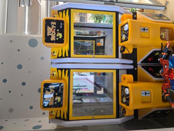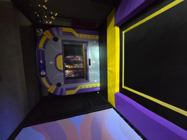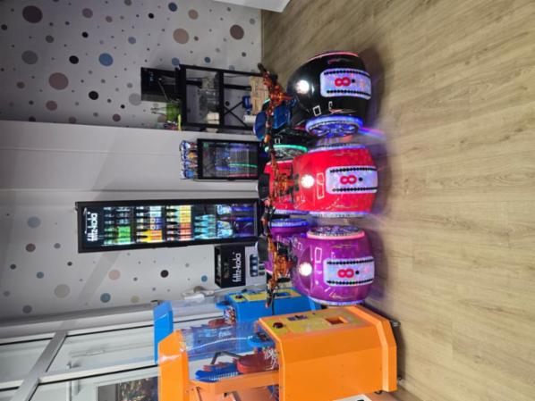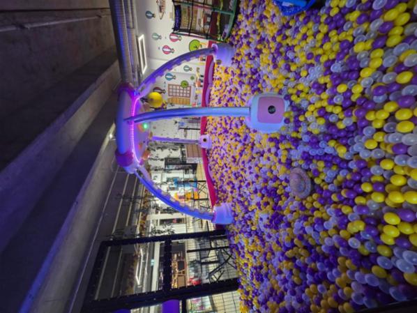 Zum Verkauf steht ein Indoorpark/Spielparadies/ Kinderkaffee mit verschiedenen Spielbereichen. Die Größe des Bällebads beträgt ca. 80 m2. Im Bällebad gibt es ein Led Ufo, an dessen Säulen sich Sauger befinden, die man per Knopfdruck einschaltet. Man schiebt dazu die Bälle in ein für sie vorgesehenes Loch rein, diese werden dann nach oben befördert, sodass die Bälle wie Regentropfen runterfallen können. Es befinden sich hier vier Sauger, die alle gleichzeitig benutzt werden können. Ganz rechts befindet sich eine Basketballwand mit mehreren Löchern, die jeweils unterschiedliche Durchmesser haben. Wirft man in eines der Löcher einen Basketball, leuchtet das Loch auf und die zwei Minuten fangen in Begleitung von Musik an zu laufen. Je nach Größe des Lochs sammelt man unterschiedliche Punkte. Die Zeit und die Punkte werden oben links auf einem separaten Bildschirm dargestellt. Außerdem gibt es ein Trampolin mit einem großen Bildschirm, auf dem das hüpfende Kind, mittels einer Kamera, als Spielfigur in das Spiel projiziert wird. Auf dem Trampolin können mehrere Kinder gleichzeitig hüpfen. Es gibt außerdem eine große Led Rutsche mit verschiedenster Farbkombinationen, der Zugang erfolgt über eine Treppe. Außerhalb des Bällebads gibt es einen Touchscreen, der mit vielen Spielen ausgestattet ist. Jedes Spiel läuft dabei 120 Sekunden.