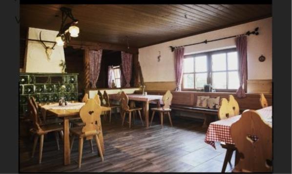 Neu eingerichtete und renovierte Gaststube im alpenländischen Stil mit urigem Kachelofen.