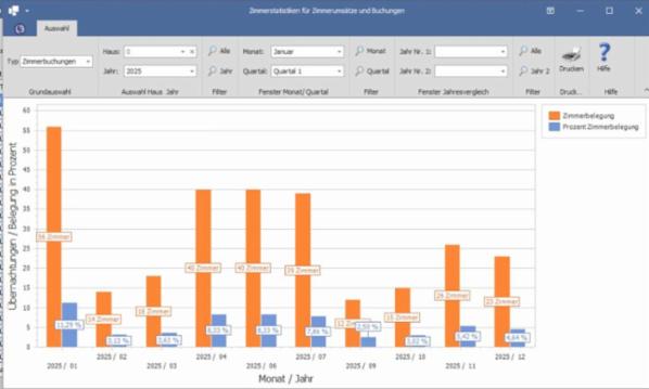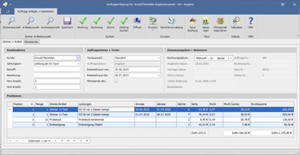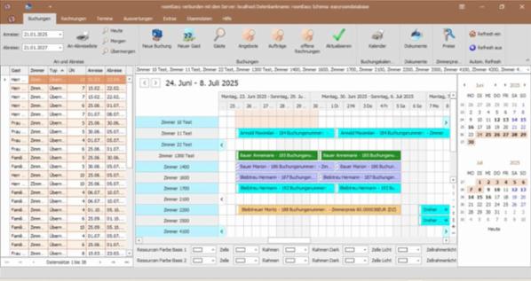 Vermieter von Zimmern, Ferienwohnungen, Appartements, Garnis können ihre Buchungen in einem optischen Belegungsplan erfassen. Angebote, Buchungsbestätigungen und Rechnungen erstellen. Integriert sind ein Kalendermodul, eine Textverarbeitung (z.B. um Mietverträge zu erstellen) und ein Report-Designer zur Erstellung individueller Formulare und Berichte.