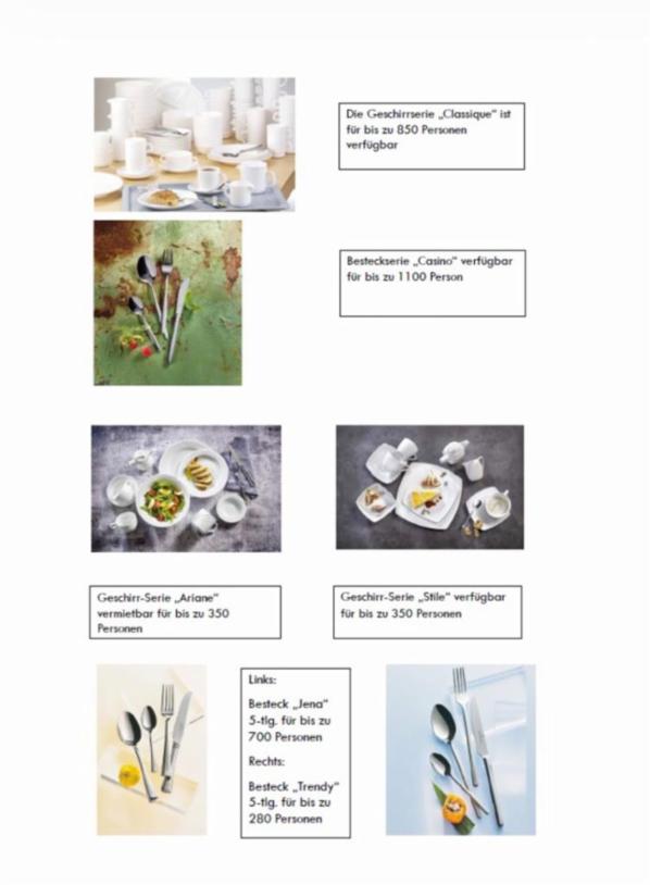 Die Ausstattung umfasst eine Geschirrserie für bis zu 850 Personen, eine Besteckserien für bis zu 1.100 Personen sowie weitere Geschirr- und Besteckserien für 280 bis 700 Personen. Dazu kommen umfangreiche Gläserserien, Bierzeltgarnituren, Stehtische, hochwertige Tischwäsche, Kaffeemaschinen, Glühweinkocher, Tellerwärmer und vieles mehr. Damit lassen sich sowohl kleine Feiern als auch sehr große Veranstaltungen professionell ausstatten.