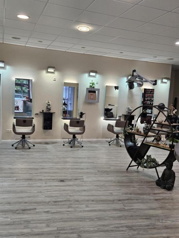 Friseursalon mit 104 qm Mietfläche , 7 Bedienplätzen, 3 Rückwärtswaschbecken mit Fußhockern, 4 Klimazonen und einer Wandhaube , Waschmaschine und Trockner ,Personalraum mit Küchenzeile, Tisch und Stühlen, kleines Büro mit Schreibtisch.