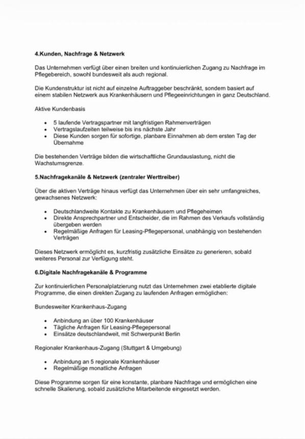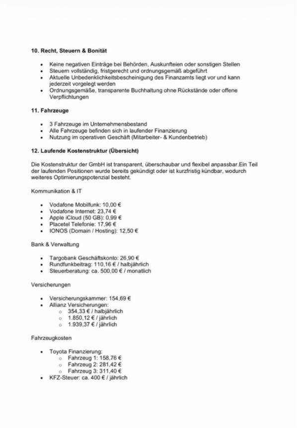 Nach Unterzeichnung einer Vertraulichkeitserklärung (NDA) können weitere Unterlagen (BWA, Verträge, Genehmigungen) eingesehen werden.