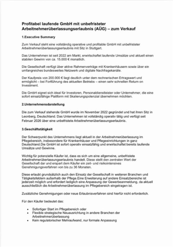 Die zum Verkauf stehende Maifin Personalleasing GmbH wurde im November 2022 gegründet und hat ihren Sitz in Leonberg (Region Stuttgart). Das Unternehmen ist vollständig operativ tätig und verfügt seit Februar 2026 über eine unbefristete Arbeitnehmerüberlassungserlaubnis.
